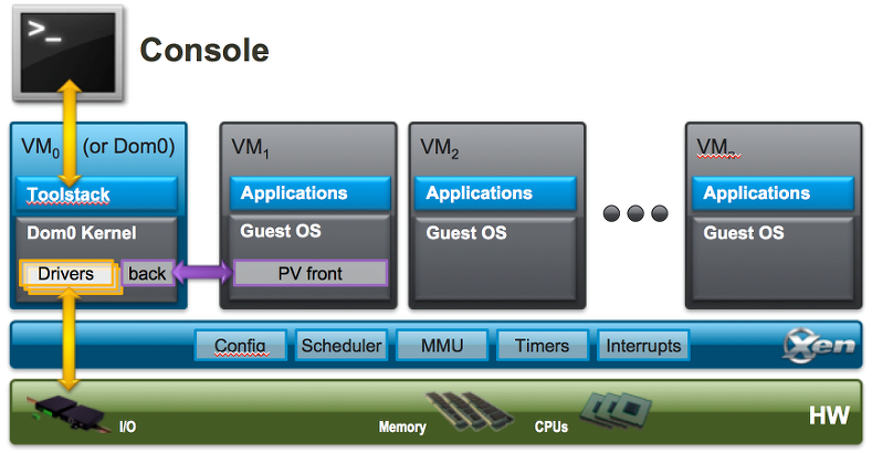 Xen 하이퍼바이저는 장치(Device)에 대한 처리는 직접 수행하지 않는 대신 장치를 관리하는 특권(Privilege)이 있는 가상 머신인 도메인 0에게 이러한 역할을 일임한다. 사용자 모드에 있는 어플리케이션이 커널의 기능을 이용할 수 있도록 커널이 시스템콜(syscall)을 제공하는 것처럼 도메인0이 하이퍼바이저의 기능을 요청하기 위해 하이퍼콜(hypercall)을 사용하고, 하이퍼 바이저가 도메인을 요청하기 위해 업콜(upcall)을 수행한다. Xen 하이퍼바이저를 통해서는 크게 반가상화와 하드웨어 지원 가상화가 가능하다.