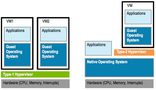 가상화에서 '게스트 운영체제'는 가상화 대상이 되는 시스템을 의미하며, '호스트 운영체제'는 가상화 프로그램을 실행하는 즉, 가상화가 되지 않은 실제 운영체제를 의미한다. Type1 하이퍼바이저의 경우 호스트 운영체제가 존재하지 않으며, 대표적으로 Xen이 있다. Type2 하이퍼바이저는 호스트 운영체제에서 가상화 프로그램을 실행하여 게스트를 실행하는 방식으로 VirtualBox, VMware 등이 있다.