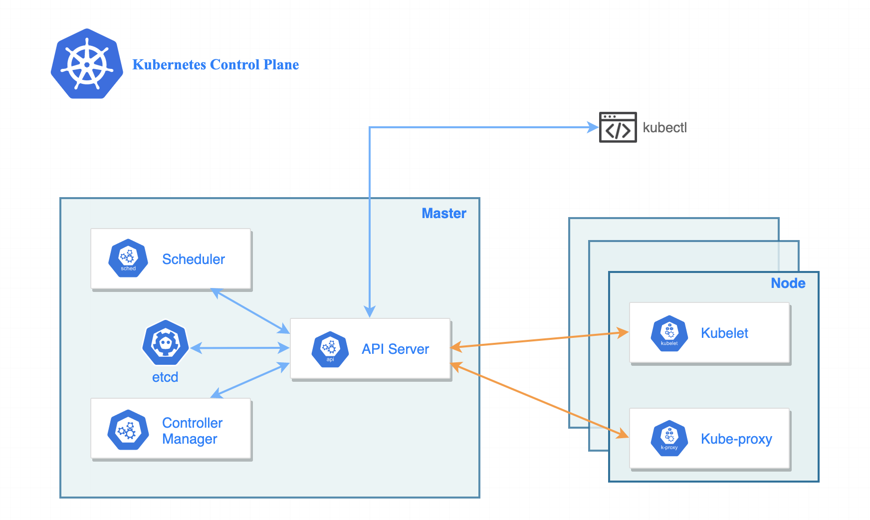 마스터 노드(컨트롤 플레인)에서는 클러스터를 관리하고 클러스터의 기능을 실행한다. 단일 마스터 노드에서 실행하거나 여러 노드로 분할 및 복제되어 고가용성을 보장할 수 있는 여러 구성요소로 구성 될 수 있다.