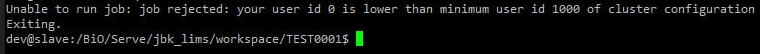 Unable to run job: job rejected: your user id 0 is lower than minimum user id 100 of cluster configuration