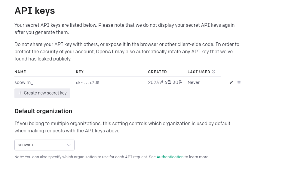 Chatgpt 회원 가입 및 아래 링크에서 key발급 받기