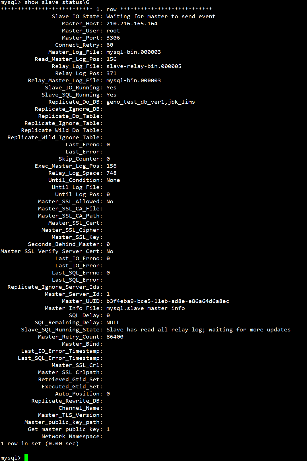 mastrer, slave  uuid 값을 확인한다.