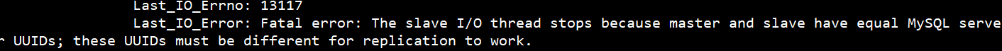 Fatal error: The slave I/O thread stops because master and slave have equal MySQL server UUIDs; these UUIDs must be different for replication to work.
