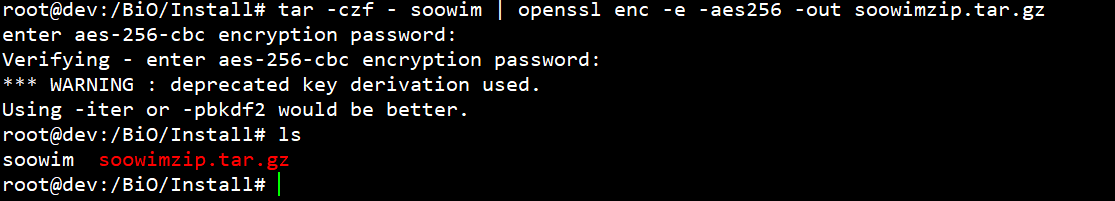 - ex) tar -czf - soowim | openssl enc -e -aes256 -out soowimzip.tar.gz